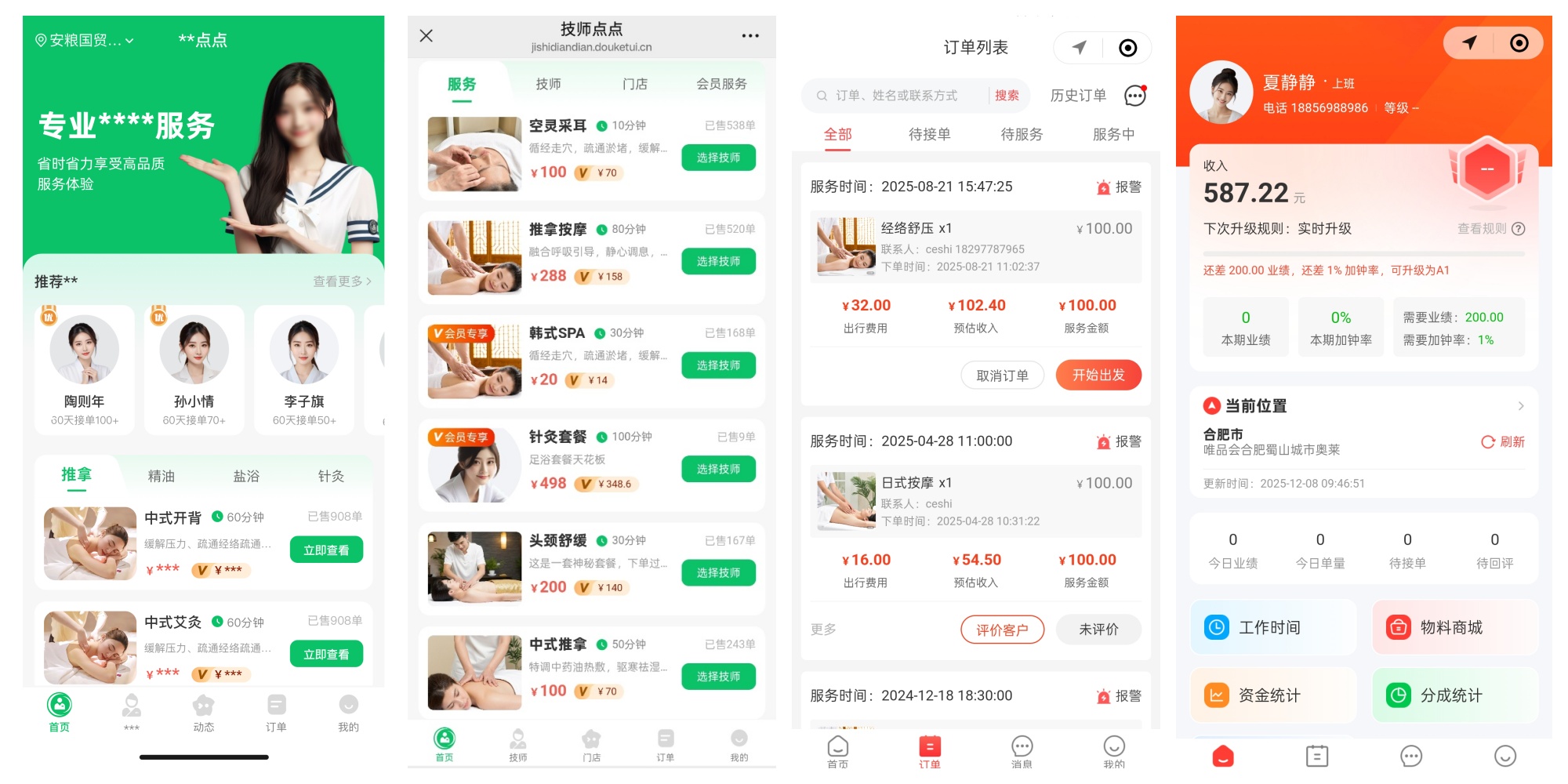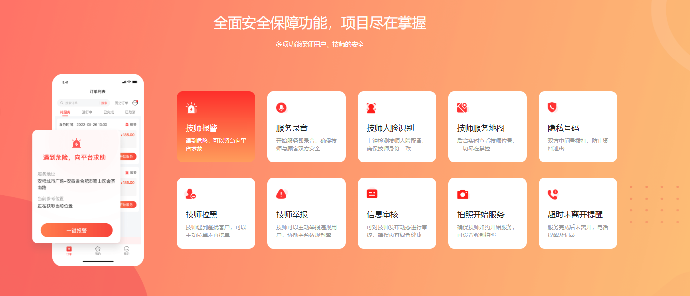 技师点点系统围绕上门服务全流程打造功能闭环,覆盖订单、服务、数据、安全等核心环节: