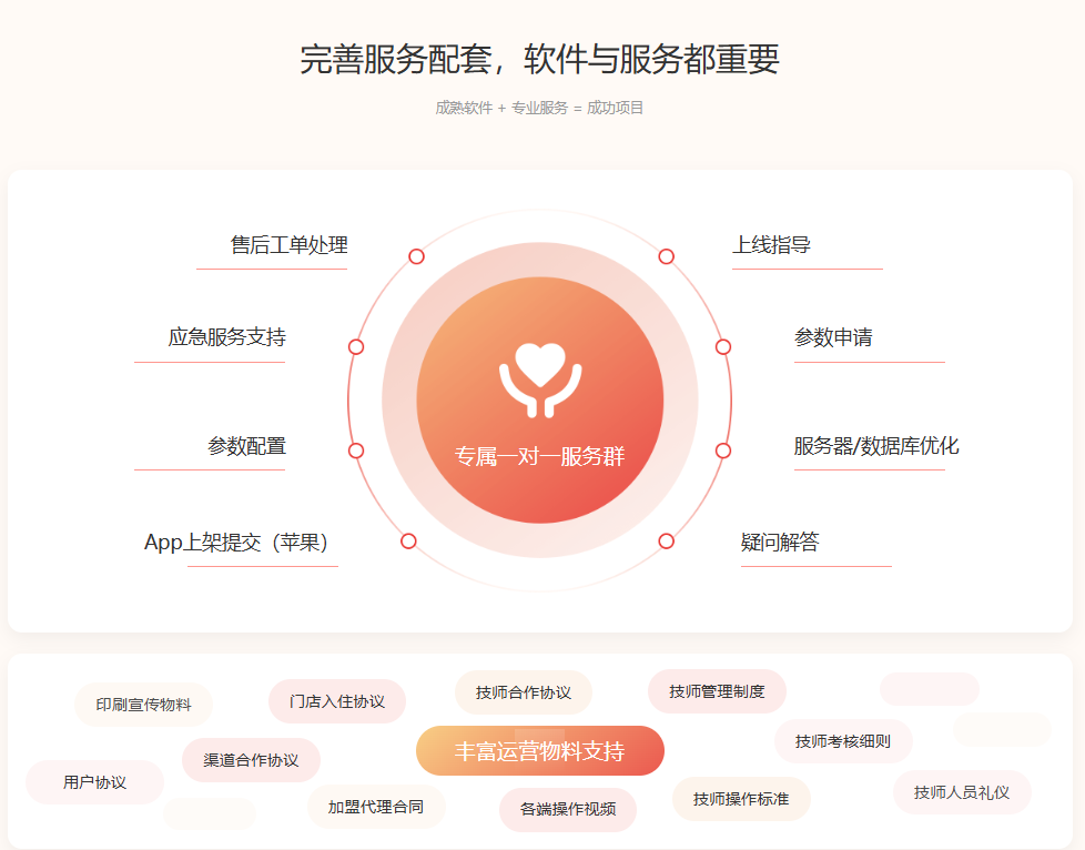 技师点点不仅功能完善,更提供全方位配套服务,保障合作后稳定运营,具体包括: