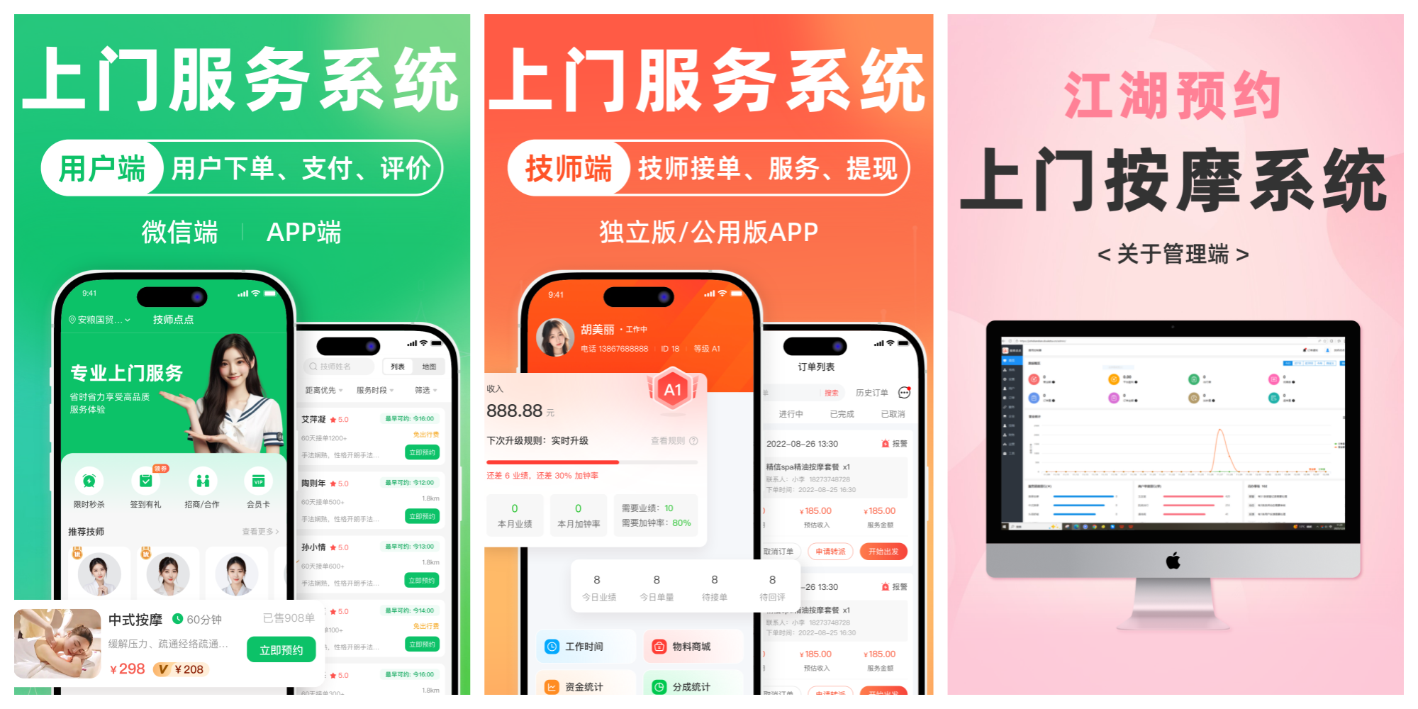 ● 核心功能覆盖:订单管理、技师管理、用户端 / 技师端 / 管理端基础功能;